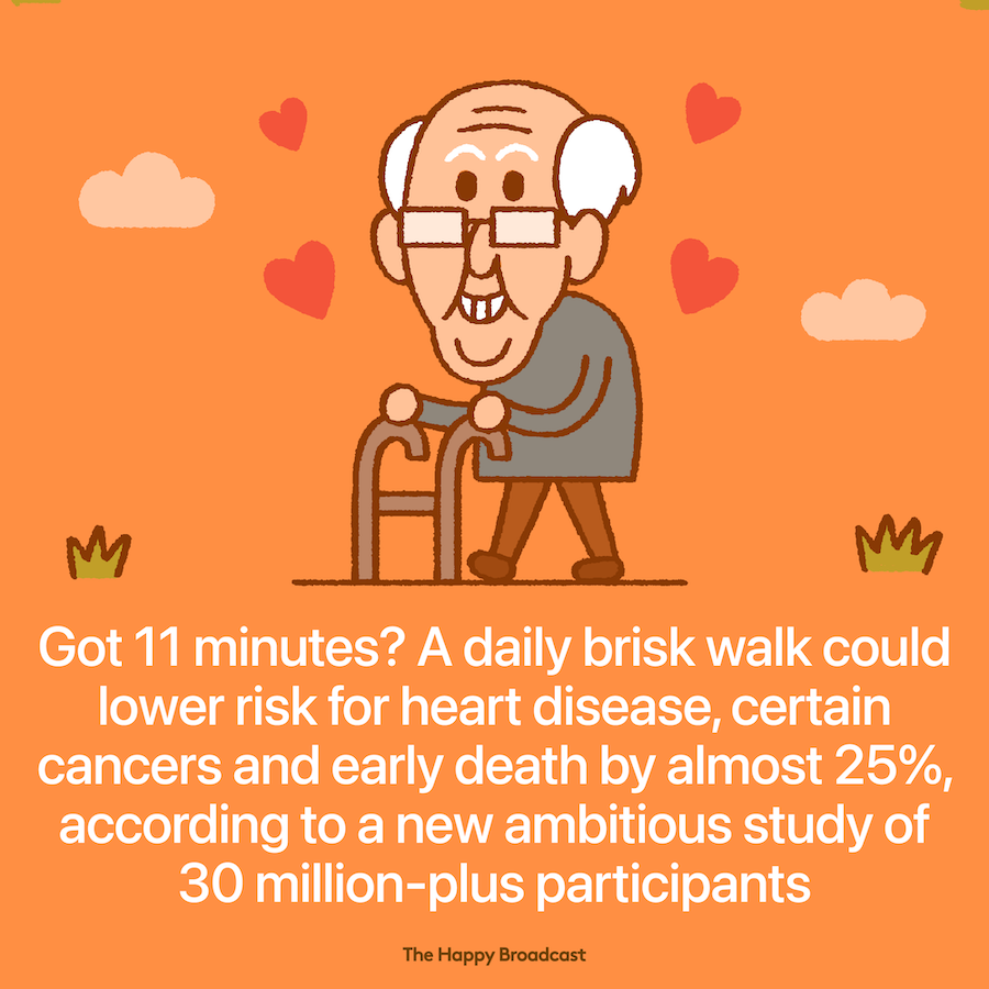Walking for at least 11 minutes every day could lower your risk of premature death by almost 25 percent, according to the largest study to date of physical activity, disease risk and mortality.