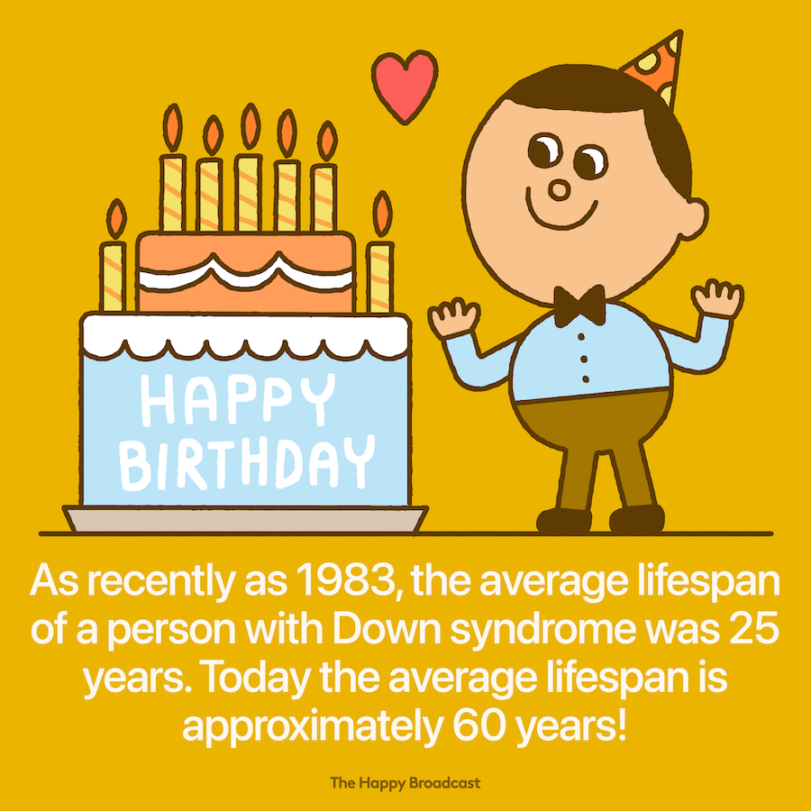Today the average lifespan of a person with Down syndrome is approximately 60 years. As recently as 1983, the average lifespan of a person with Down syndrome was 25 years. The dramatic increase to 60 years is largely due to the end of the inhumane practice of institutionalizing people with Down syndrome.