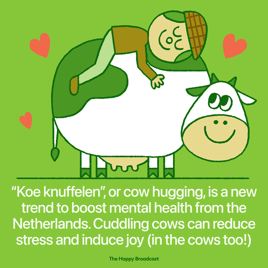 Cow cuddling is believed to promote positivity and reduce stress by boosting oxytocin in humans, the hormone released in social bonding. The calming effects of curling up with a pet or emotional support animal, it seems, are accentuated when cuddling with larger mammals.