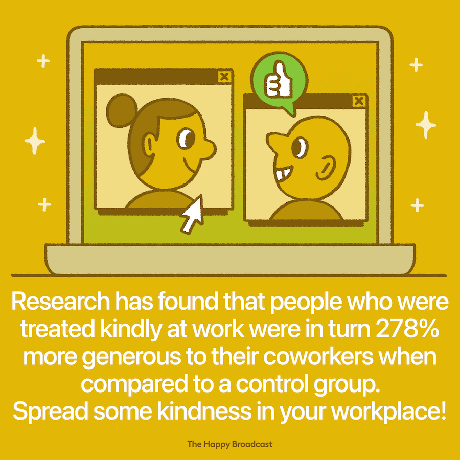 According to a recent study from the American Phychological Association, people who were treated kindly at work repaid it by being 278% more generous to coworkers compared to a control group. Research has found that kindness encourages increased health and increased emotional well-being in the workplace.