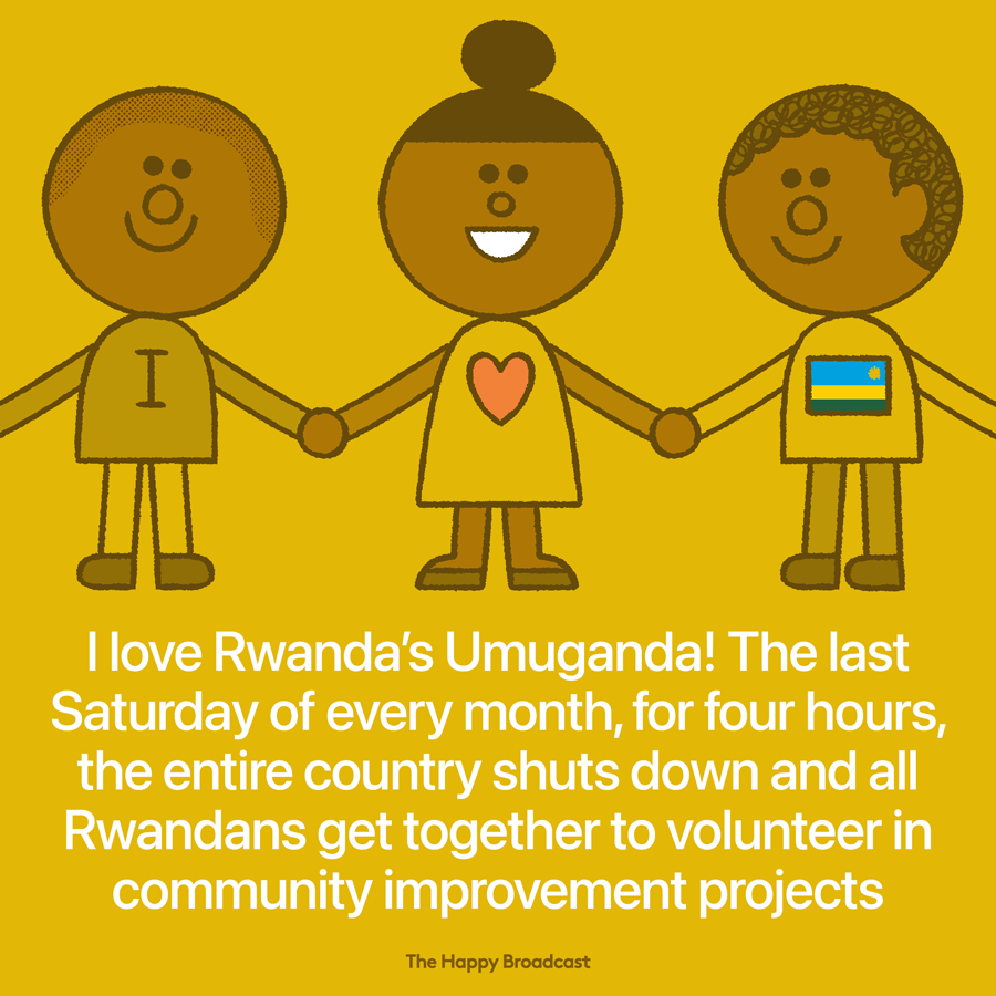 The entire country shuts down to take part in government-mandated community service called "Umuganda," a Kinyarwanda word that means "coming together in common purpose to achieve an outcome."